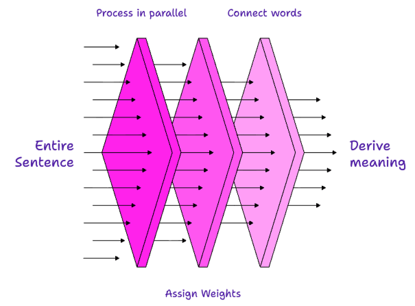 The model looks at the entire sentence at once (parallel processing).